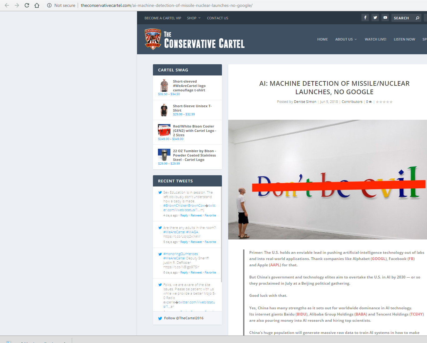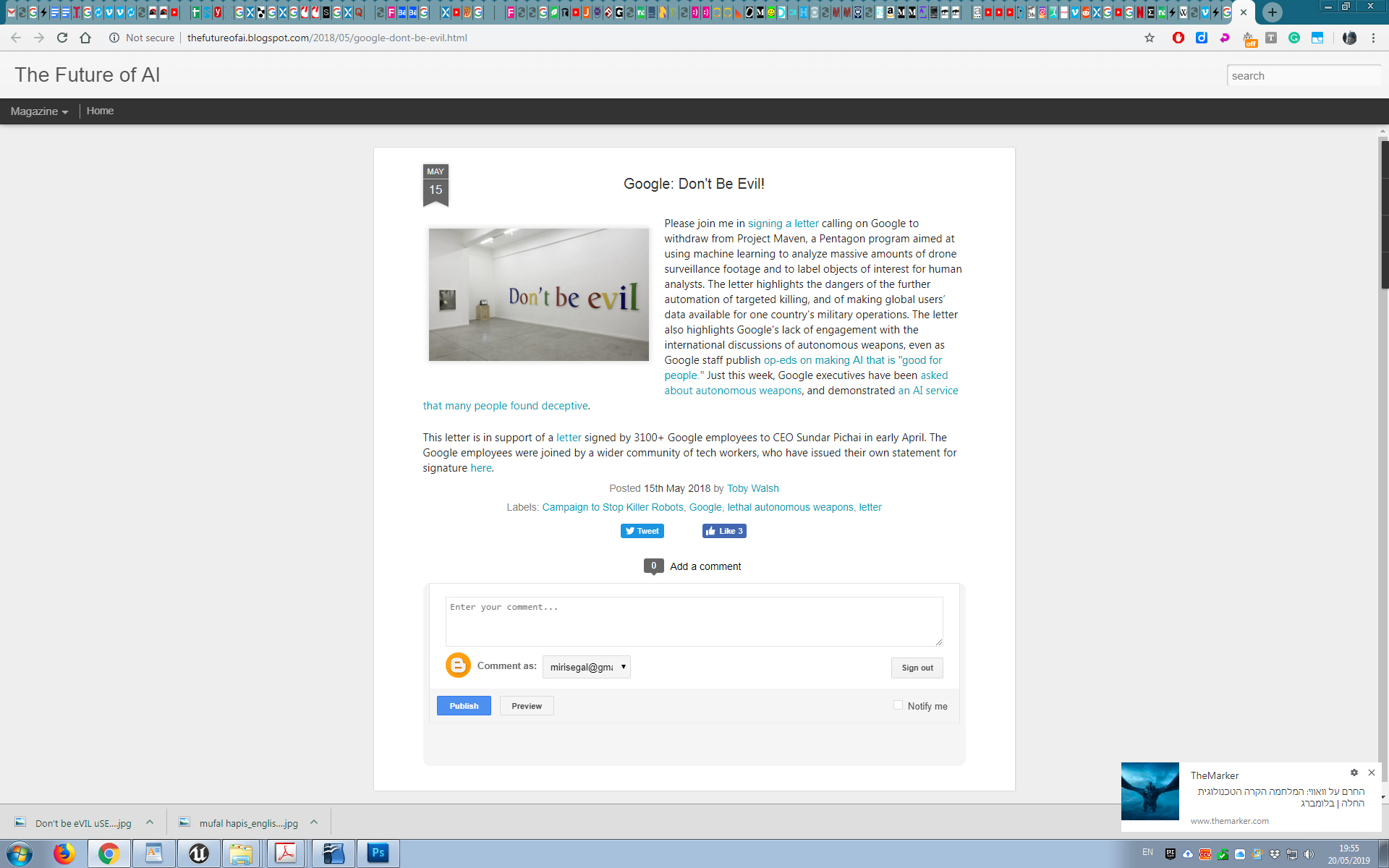 (Perhaps as a result), in May 2018, Google removed the "Don't Be Evil" from its Code of Conduct. Again, images of the work were used in articles regarding removal.